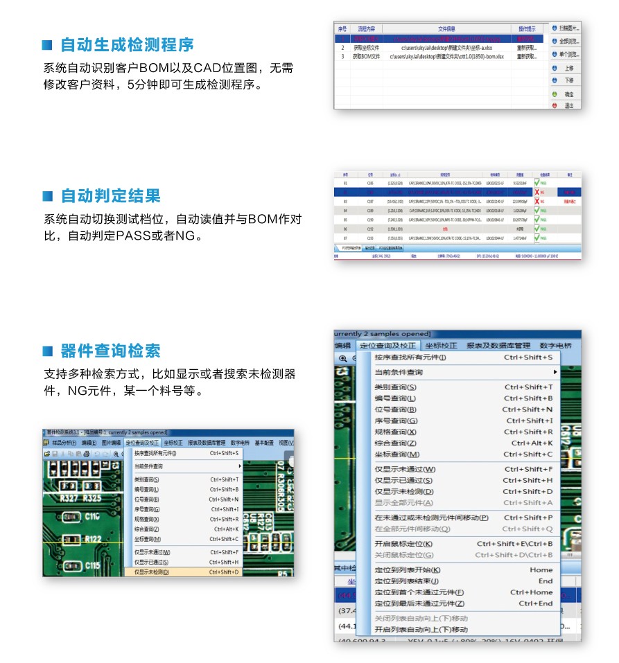 | 設(shè)備功能 | 測(cè)值、絲印對(duì)比、貼裝角度判別、檢測(cè)未貼裝 |
